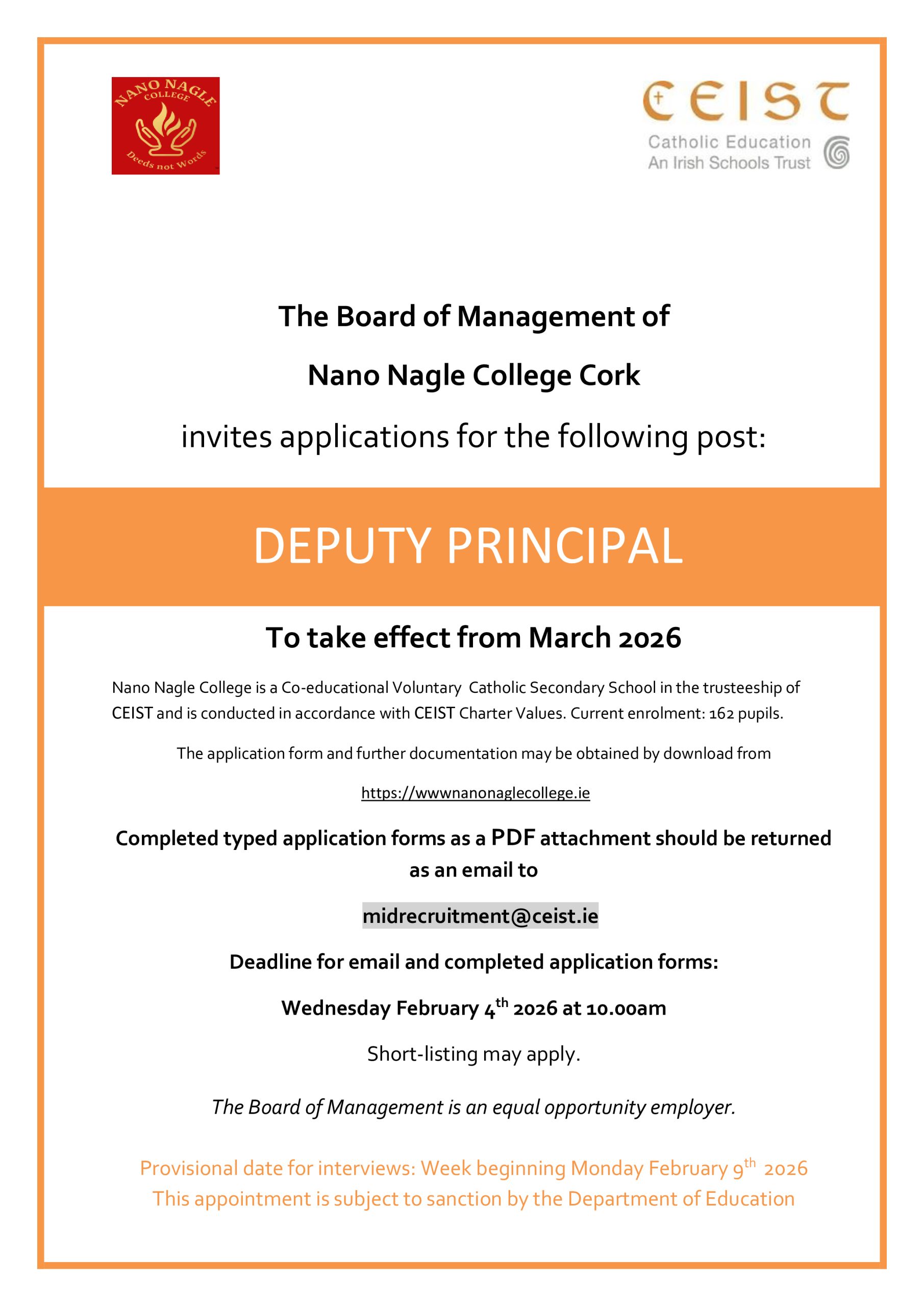 The Role of Deputy Principal, Nano Nagle College, Farranree, Cork