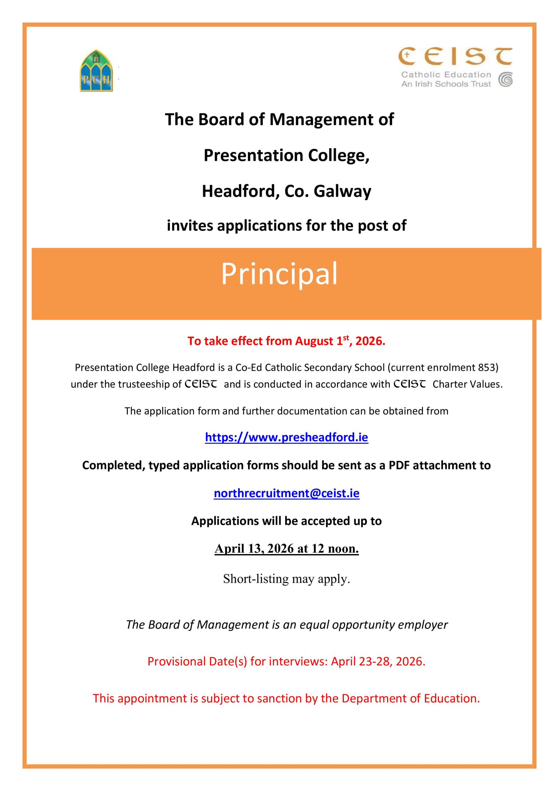 Current vacancies in CEIST schools recruiting a Principal or Deputy Principal.